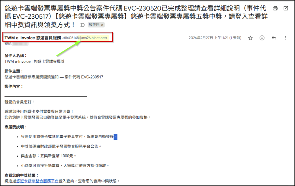 收到這類Email 時,第一個需要檢查的,寄件信箱的「實際網域」。真正的官方通知,寄件信箱通常會來自正式網域,例如政府常見的 gov.tw,或企業的官方網址網域 (@後面的網址 – 見下方截圖綠色箭頭)。