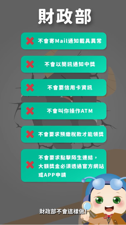 財政部也於官方網站聲明: 財政部不會以簡訊通知中獎、不會要信用卡資訊、不會叫你操作ATM等,冷靜查證,別掉入詐騙陷阱!