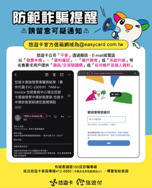 悠遊卡公司在2/26 於臉書強力聲明,他們不會透過簡訊、E-mail或電話方式,以「發票中獎」、「資料確認」、「帳戶異常」、「系統升級」等名義要求或通知用戶,提供「簡訊/交易驗證碼」或任何帳戶及個人資料。強烈呼籲用戶切勿點選不明連結或信件填寫任何個人資料、帳戶資訊或其他機敏資料,以免落入詐騙集團的陷阱。